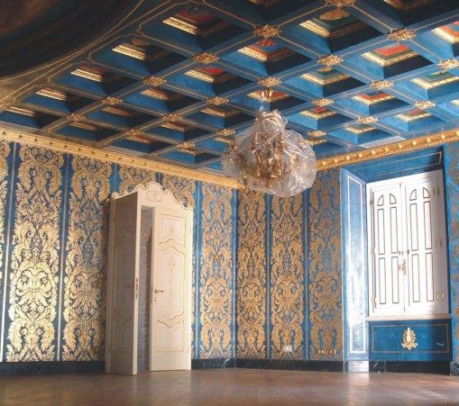 Intervento di decorazione sulle pareti, volte, soffitti a cassettoni, scale e stucchi della villa interamente dipinte a mano con soggetti ispirati agli artisti della storia dell’arte come Michelangelo, Botticelli, Giulio Romano, Paolo Uccello ed elementi decorativi di varie epoche stilistiche. Applicazione di foglia oro ai soffitti e alle pareti con decorazioni a damasco dipinti come una finta tappezzeria.