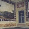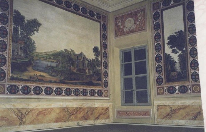 Integrazione grafica e pittorica del paesaggio, bordature a finto marmo e stampigliature floreali.